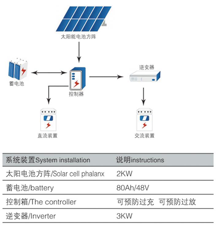 白天通過太陽電池方陣發(fā)的電儲(chǔ)存在蓄電池電池中,滿足軍隊(duì)營(yíng)區(qū)生活照明和辦公設(shè)施使用。
